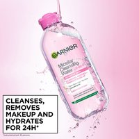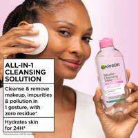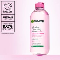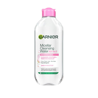 Plejende ansigtsrens og makeupfjerner i én. Garnier Micellar Cleansing Water Normal & Sensitive Skin 400 ml er micellar water med en plejende formel, som hurtigt renser huden og fjerner makeup på samme tid. Fri for parfume og velegnet til normal til følsom hud. Testet under oftalmologisk og dermatologisk kontrol. Garniers serie af micellar water er baseret på plejende formler, som hurtigt renser huden og fjerner makeup på samme tid, så du sparer dyrebar tid, og huden føles frisk og behagelig!
