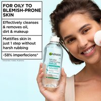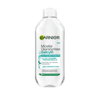 Garnier Micellar Cleansing Water Salicylic er et alt-i-et-renseprodukt, som er specielt udviklet til dog med fedtet og uren hud, selv sensitiv hud. Rensevandet renser effektivt din hud og fjerner snavs, makeup og forurening, samtidig med at den reducerer urenheder* og gør din hud mat. Efterlader ingen synlige produktrester på huden**.